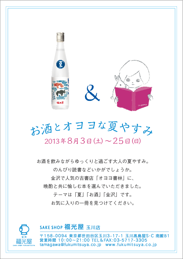 「お酒とオヨヨな夏やすみ」という企画に参加させていただきます。 牧野伊三夫画伯の描く金魚のラベルが涼しげな夏のお酒「夏やすみ」に合わせて、夏の本を選書させていただきました。 東京近郊にお住まいの方、期間中、東京に行かれる方は是非お立ち寄り下さい。 とき:2013年8月3日(土)〜 25日(日) ところ:SAKE SHOP 福光屋玉川店(玉川高島屋内) 150冊ほどの夏の本を販売しております。