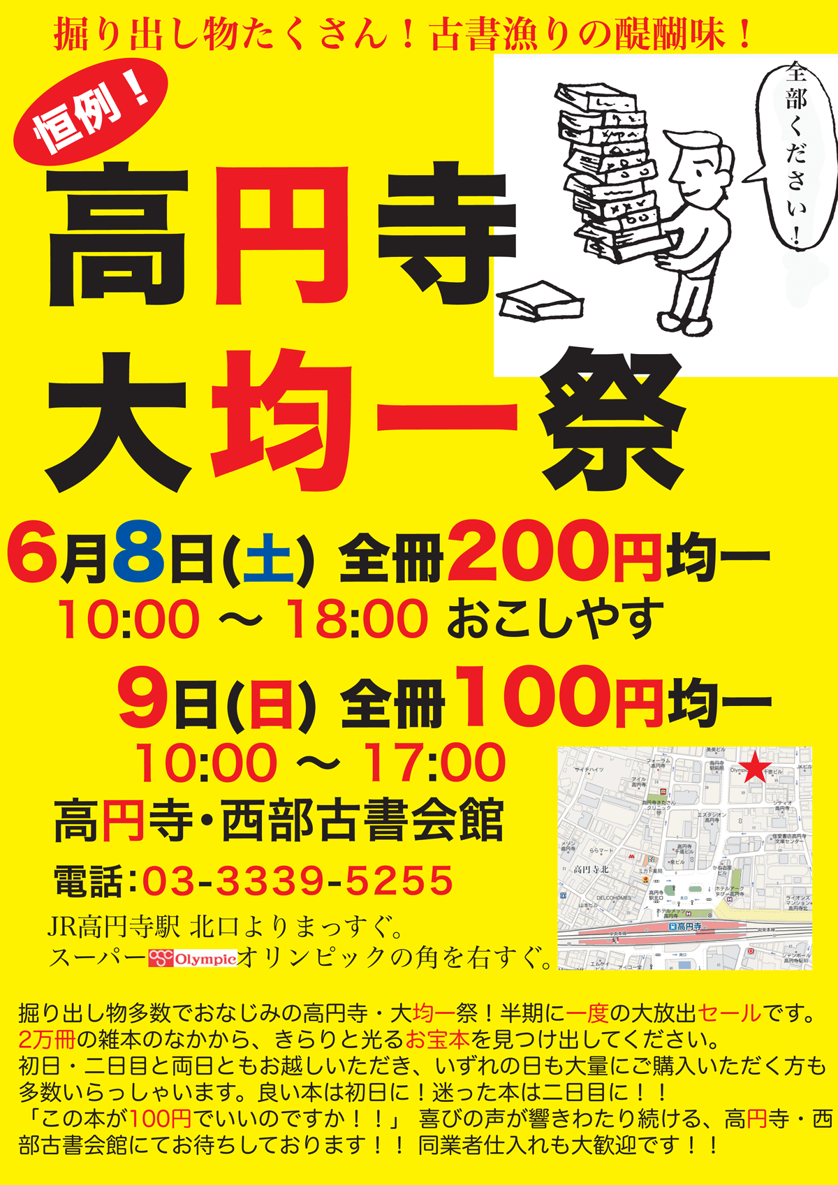 6月8日(土)9日(日)!開催します! 高円寺大均一祭 2013年第2弾!! 全国の古書ファンのみなさま、お待たせしました。 掘り出し物多数でおなじみの、高円寺大均一祭、開催いたします。 高円寺の西部古書会館にて、6月8日(土)、9日(日)の2日間限定。 初日はどれでも200円均一、2日目はなんと100円均一にて大放出の、驚きの大古書祭です。 マニア向けの黒っぽい本から、高円寺の若者向けの最近の雑誌まで、初日200円、2日目100円でお待ちしております。気持ちの良い初夏の古本漁りをお楽しみください。 166-0002 杉並区高円寺北2-19-9 西部古書会館 tel 03-3339-5255 http://koenji100.wordpress.com お時間のある方は是非お越しください。 千円もあればたいぶ買えると思います。マニア、セミプロ、セドラー、ビームせどり、同業者の方も大歓迎です。 参加書店:オヨヨ書林、Paradis、古本酒場コクテイル