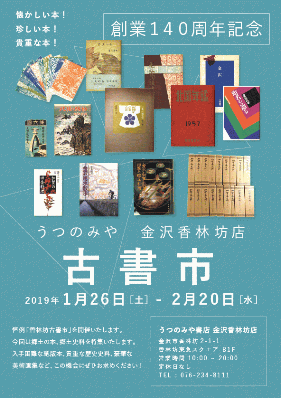 恒例「香林坊古書市」を開催いたします。 今回は郷土の本、郷土史料を特集いたします。 入手困難な絶版本、貴重な歴史史料、豪華な美術画集など、この機会にぜひお求めく…