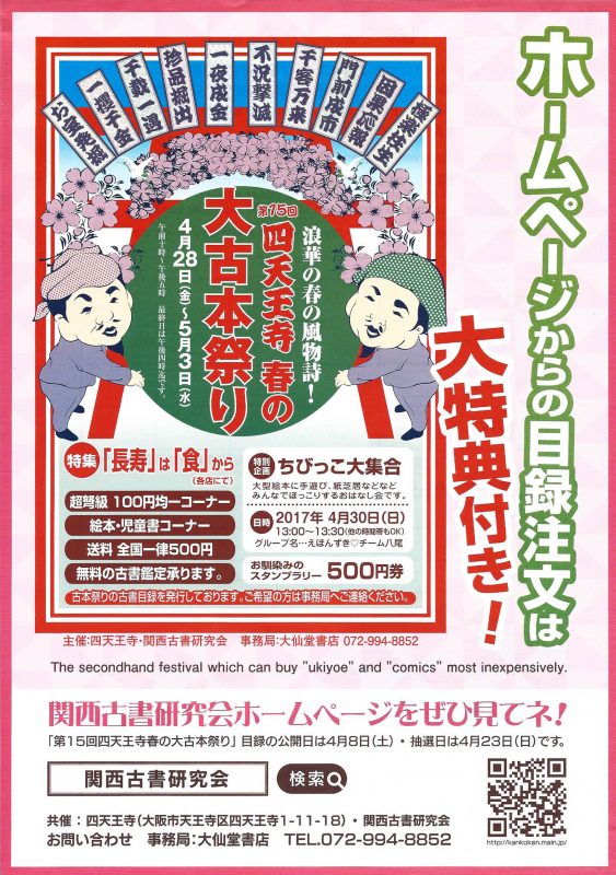 浪華の春の風物詩 第15回 四天王寺 春の大古本祭り 特集:「長寿」は「食」から 日時:2017年4月28日(金)~5月3日(水) 10時~17時(最終日は16…