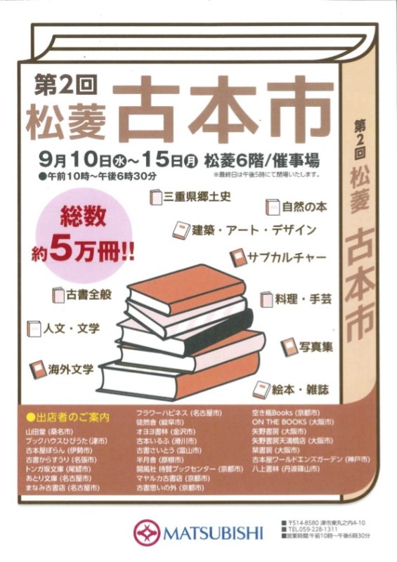 第2回松菱古本市 2025年9月10日(水)〜15日(月) 松菱 6階/催事場(津市) 午前10時〜午後6時30分 ※最終日は午後5時にて閉場いたします。 総数…