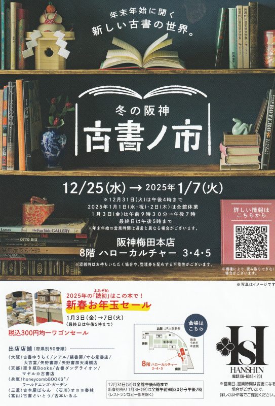 冬の阪神 古書の市 日時:12月25日(水)〜1月7日(火)(1月1日、2日は全館休業) 会場:阪神梅田本店 8階催場 1月3日〜7日は、お年玉セールとして30…